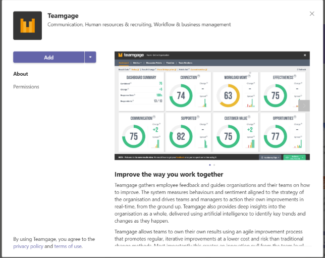 The Teamgage integration with Microsoft Teams allows employees to: Receive Teamgage notifications directly in Teams chat Submit feedback & launch the Huddle dashboard to review results With Single Sign-On (SSO), users can enjoy a seamless experience ...