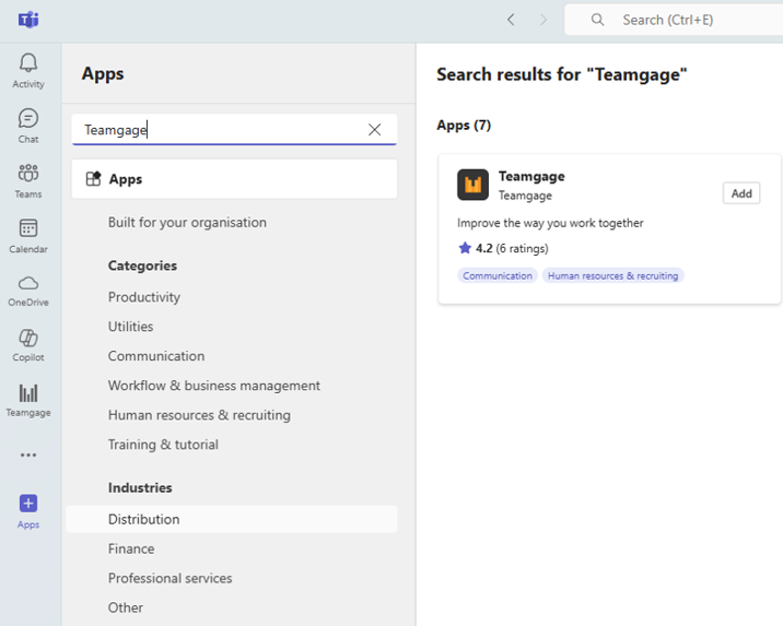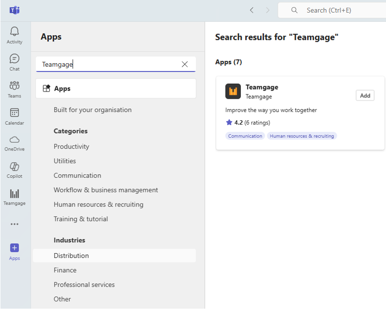 - In Teams, click Apps in the left-hand menu and search for Teamgage