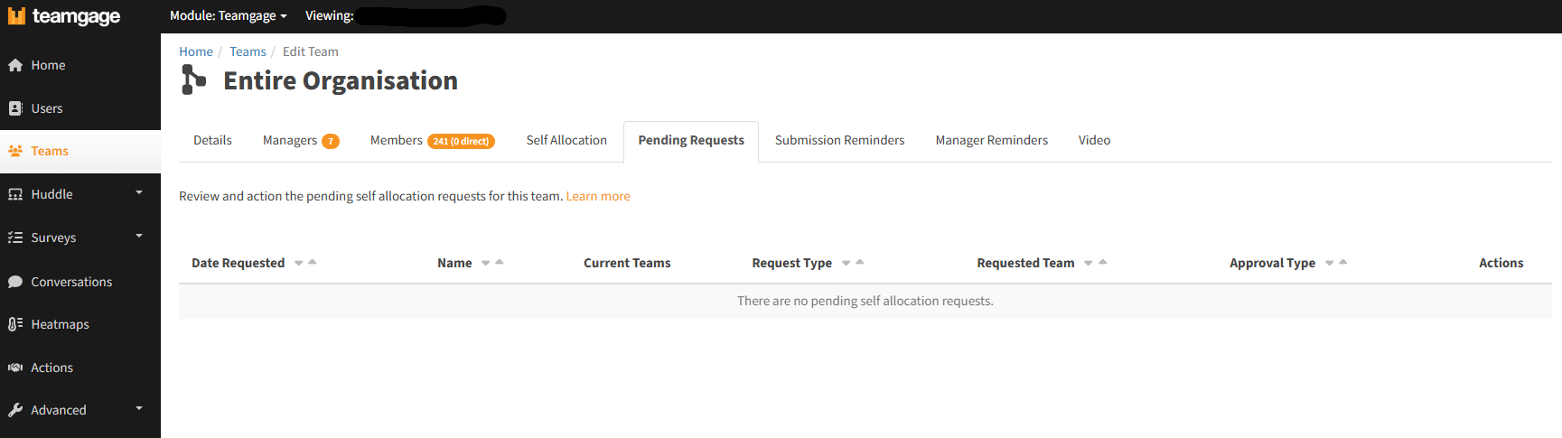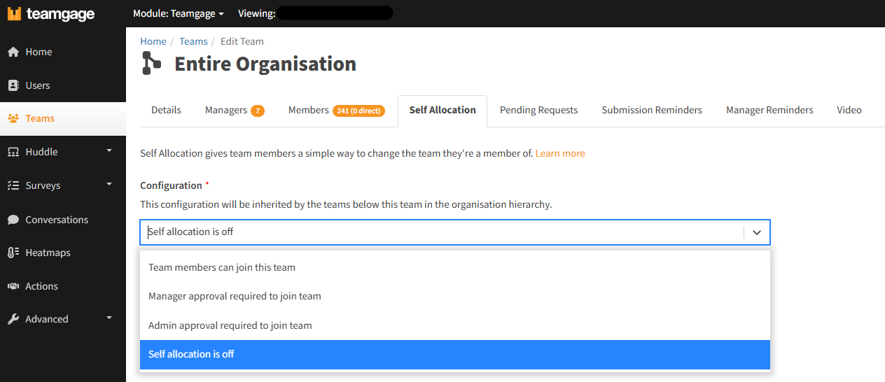 - To completely disable Self Allocation across your organisation, edit the Entire Organisation team and set Self Allocation is off