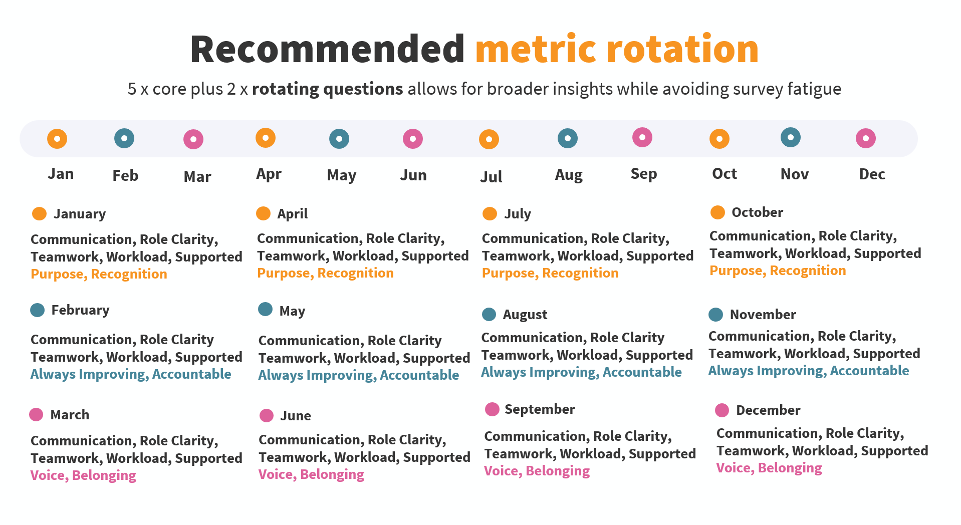 Rotating Metrics: updated monthly on a quarterly cycle to measure wider culture and engagement drivers that shift less frequently. Rotating avoids survey overload while providing deeper insights.