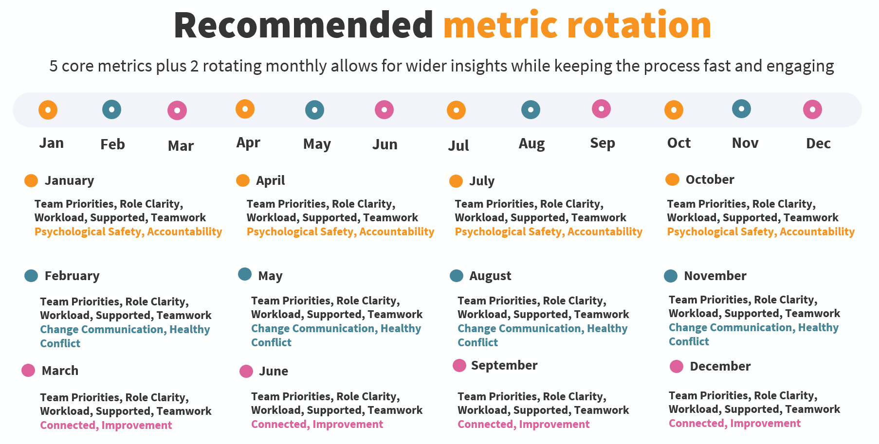 Research consistently shows that shorter surveys maintain participation, reduce cognitive load, and produce more reliable data when used regularly. Seven metrics balances insight depth with sustainability for continuous pulse use.