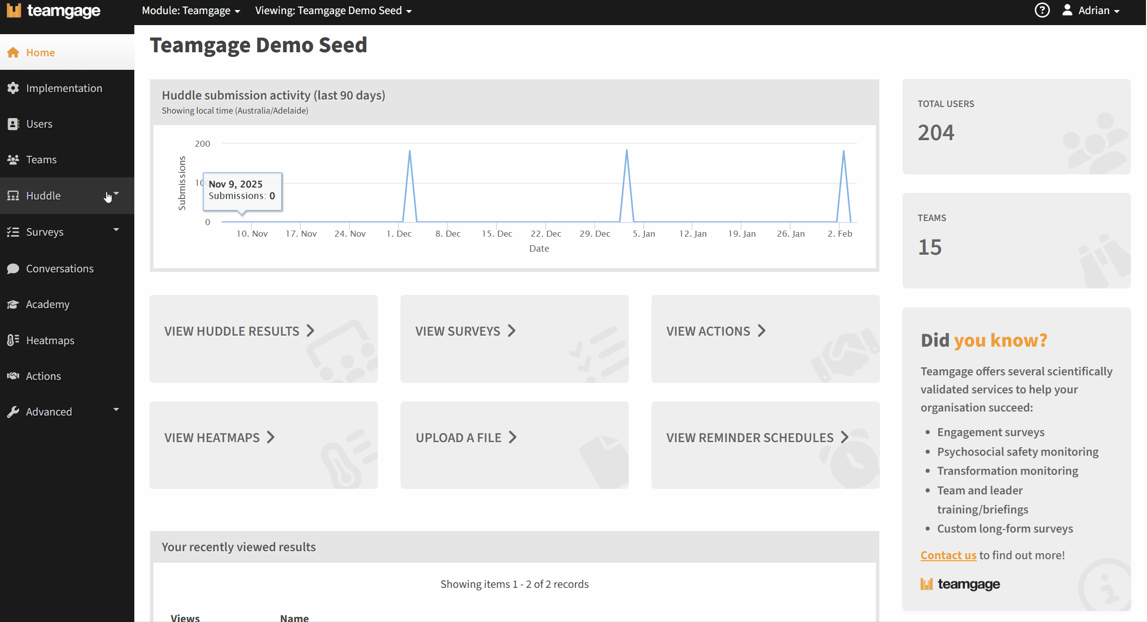 - Navigate to Huddle > Results from the left-hand menu