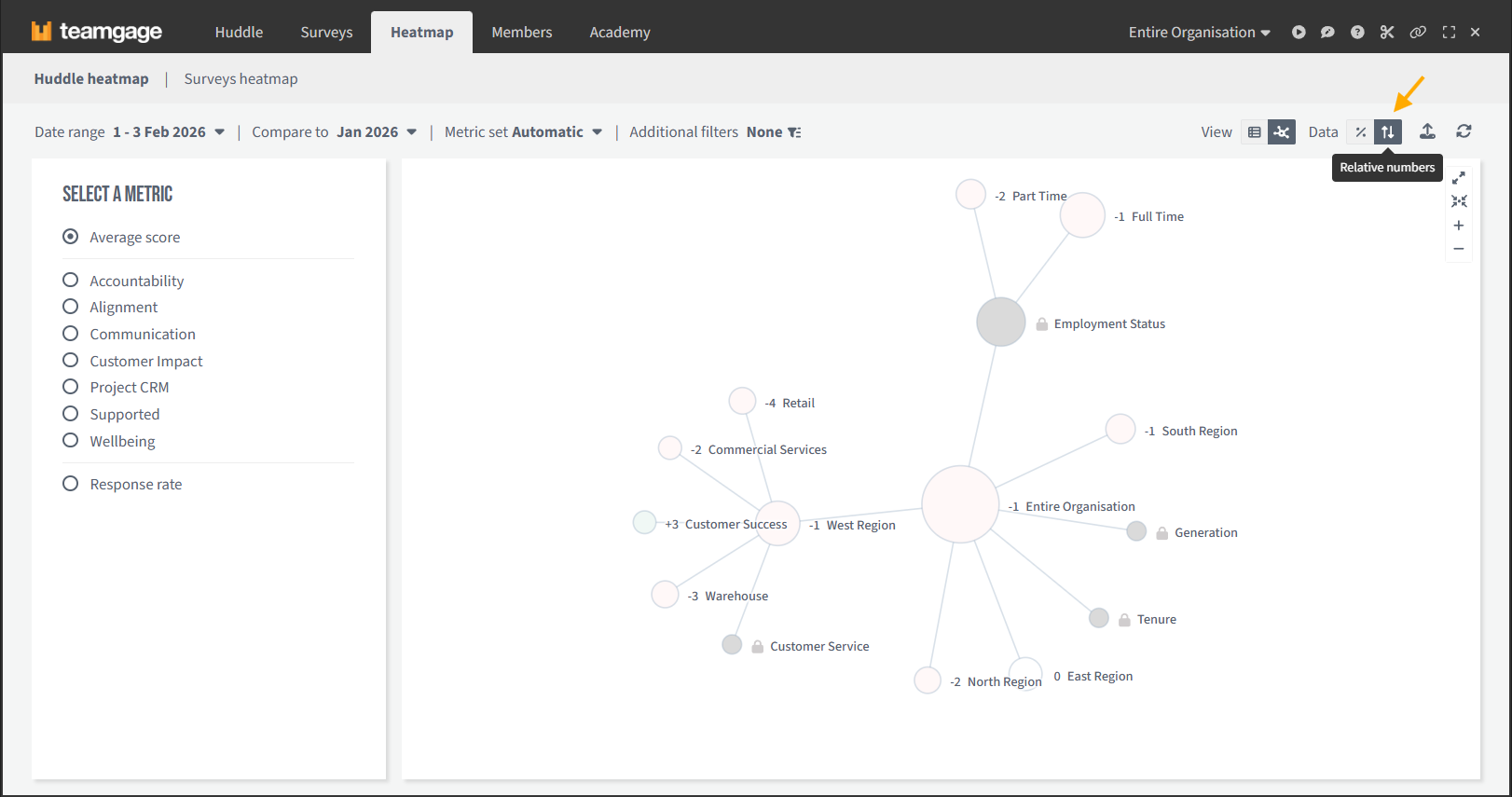 The Heatmap Node View provides a visual, interactive way to explore organisational results. It brings your organisation’s structure to life using nodes and connections, making it easy for leaders to quickly understand what’s working, what needs attention and where to focus next.