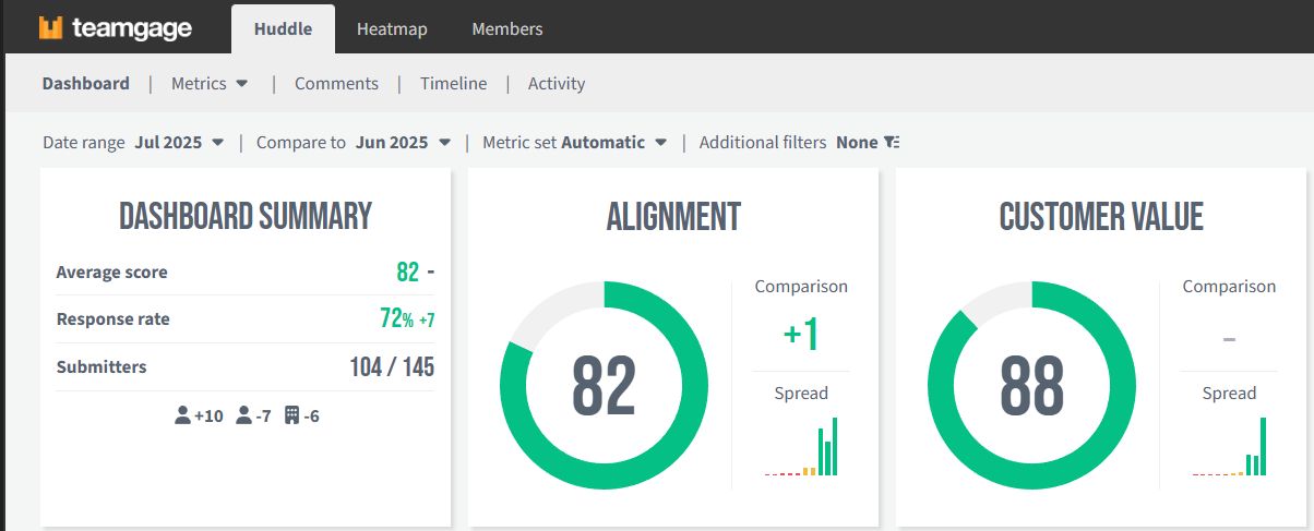 If you open your Team’s Huddle Dashboard and notice that the change value (the + / – number) within the Dashboard Summary or in a metric card is empty, it usually means you’re comparing two time periods where there has been no measurable change.